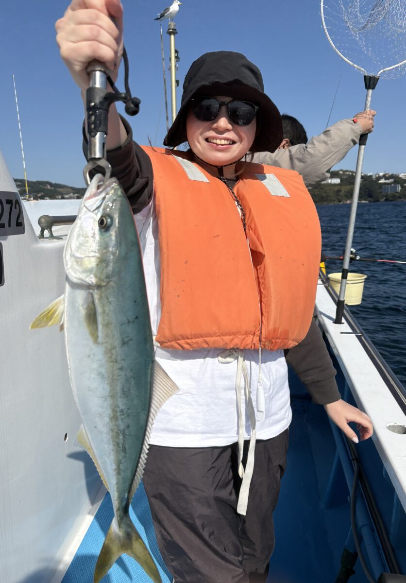 レンタル竿の竿先がズドン!叩き具合からマダイ?でしたが、丸々と立派なベイト食いイナダ。初めての船釣りでお見事で…