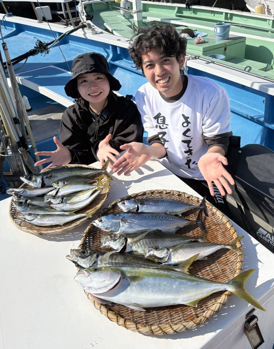 初めて船釣りされた向かって右のVサインのお客さまお一人での釣果です!(念の為)