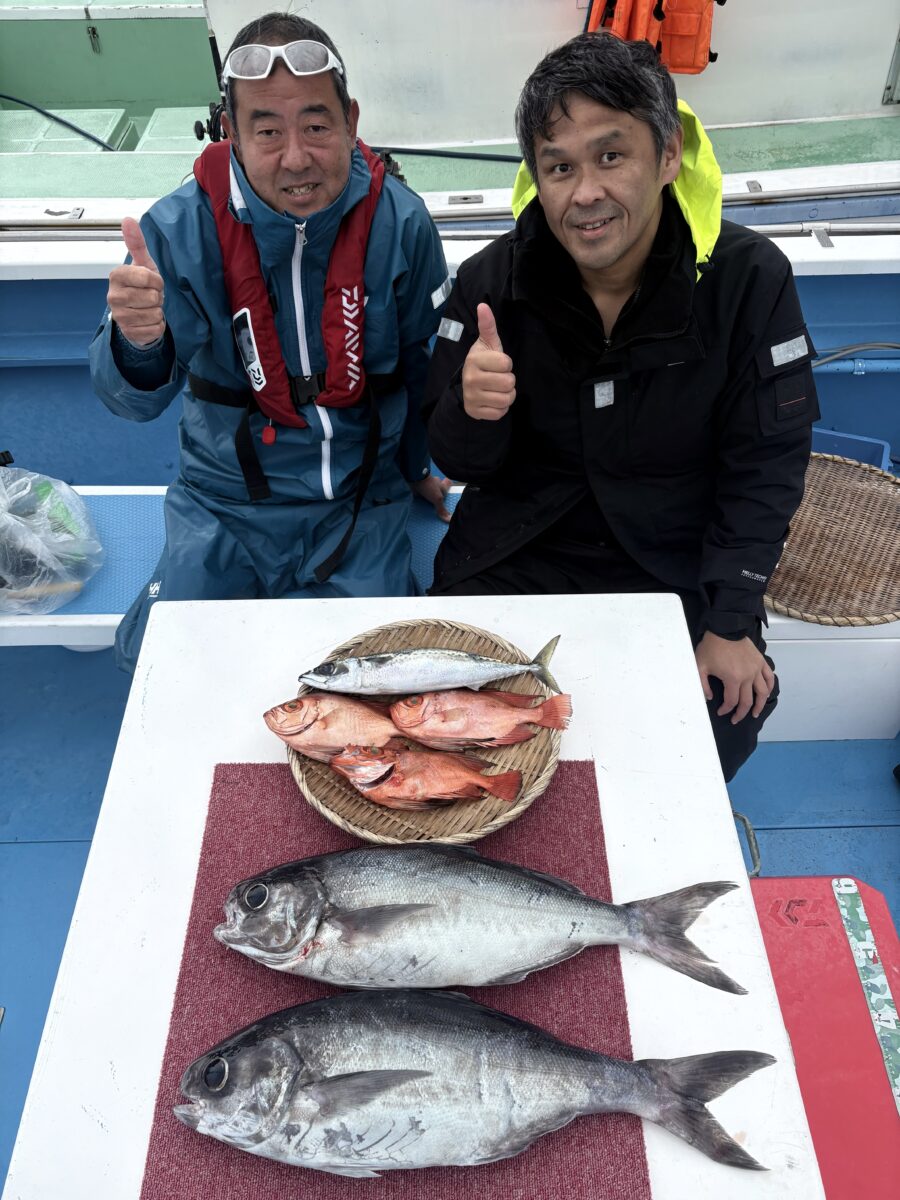 本日(21日)午前はコマセ五目乗合船でお2人さまのご案内でした。 前線通過の影響から、南西風が強く(体感8m位…